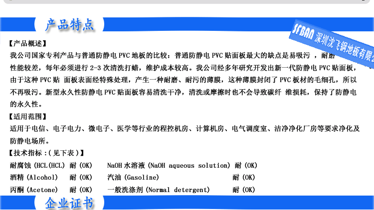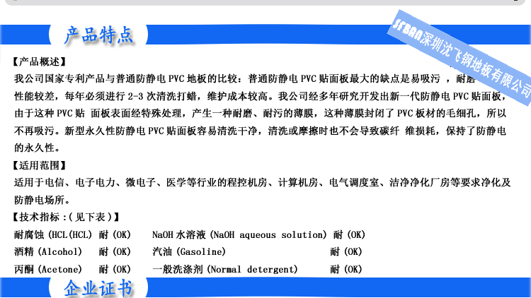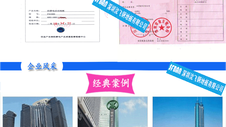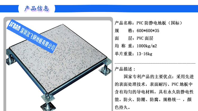 PVC全鋼高架地板 產(chǎn)品型號: 2.00MMPVC全鋼高架地板 規(guī)格: 600×600×35㎜ 產(chǎn)品說明: 永久性防靜電PVC地板是一種彈性均質(zhì)的氯乙烯地面材料,其內(nèi)部的PVC顆粒表面有一層導(dǎo)...